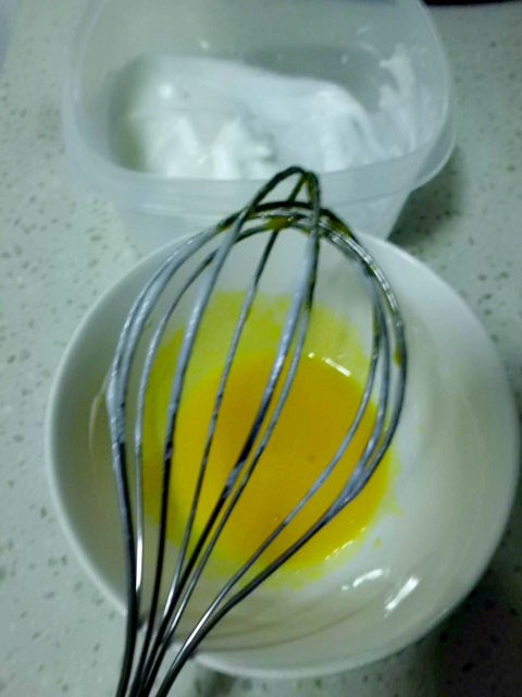 | beat the egg white (to stiff peaks) & yolk (to a creamish mix) separately, with 1/2 the sugar respectively |